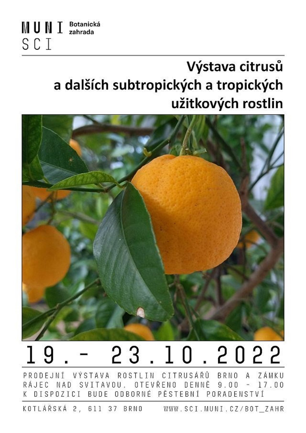 Srdečně vás zveme do botanické zahrady PřF MU na letošní ročník prodejní výstavy citrusů a dalších subtropických a tropických užitkových rostlin, kterou pro vás připravili členové klubu Citrusáři Brno ve spolupráci se zámkem Rájec nad Svitavou a Masarykovou univerzitou. Na výstavě budou přítomni i zkušení pěstitelé, kteří vám rádi poradí s pěstováním exotických rostlin.